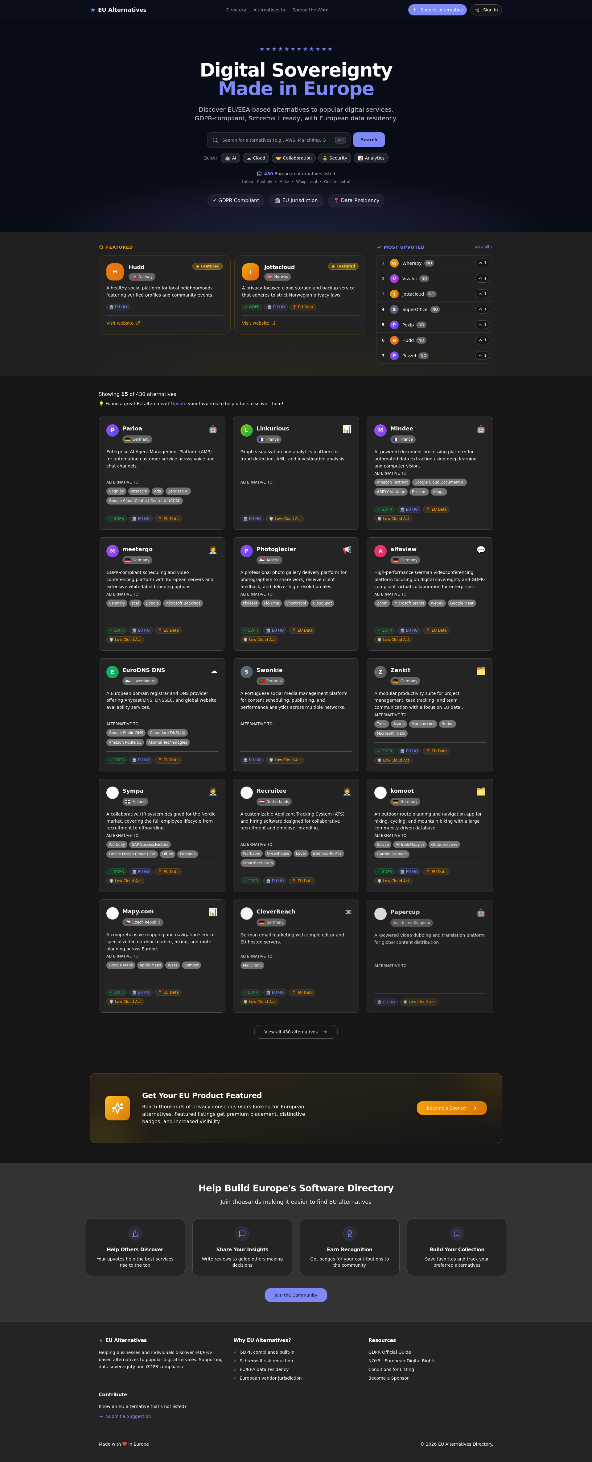 arrow-up190arrow-down1external-linkEU alternatives directory - Digital Sovereignty Made in Europe - 430 solutions listedplus-squareeualternatives.directoryBlaze@piefed.zipEnglish · 19 hours agomessage-square8linkfedilink