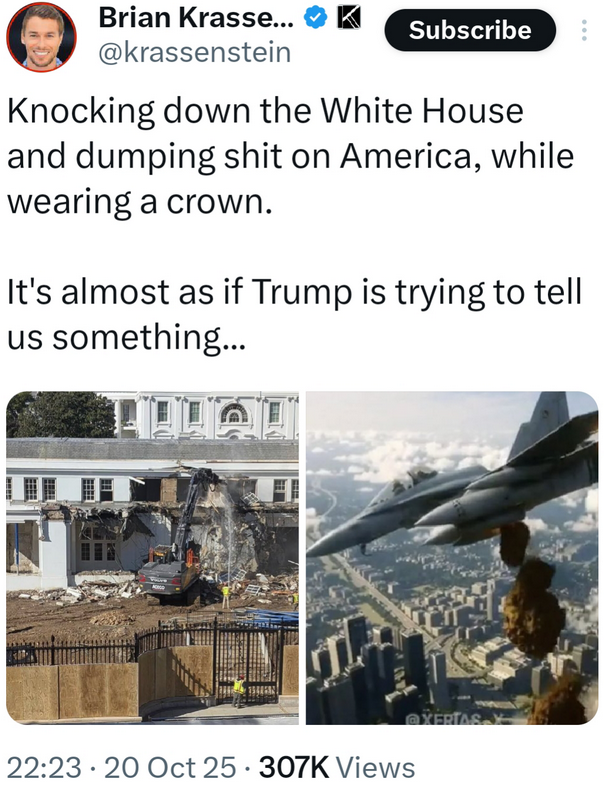 bzIlsn8Fxi@lemmy.worldEnglish · edit-22 days agoDid you see the AI-generated propaganda video of trump dumping feces on Americans? He literally took a shit on Constitutionally protected free speech.plus-squarelemmy.worldimagemessage-square79fedilinkarrow-up1901arrow-down123
