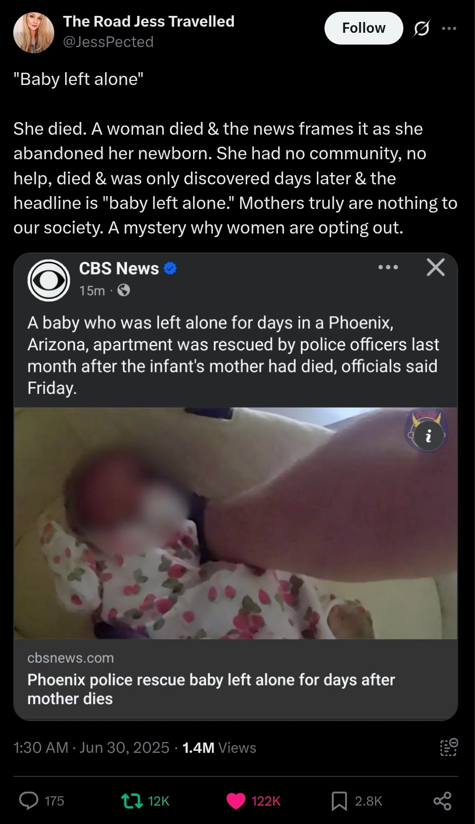 “Left alone” is an intentional act. The mother died so unless it was suicide she didn’t leave the baby alone. And then it was in the US and the US has the highest maternal mortality in the West. The headline downplays the tragedy of the mother’s death, ignores the tragedy of the high maternal mortality, makes it sound a bit like she was a bad mother rather than a mother that society didn’t do right by.
