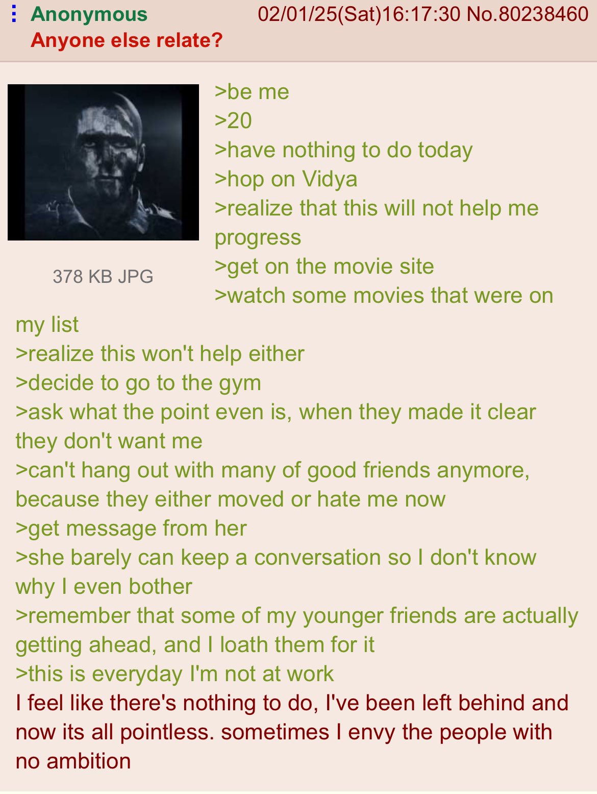 So many of these guys consider themselves Patrick Bateman irl, I’d absolutely not be surprised if it wasn’t just “I wish I was happy despite having no ambitions”, but rather he considers himself a “temporarily embarassed achiever”
