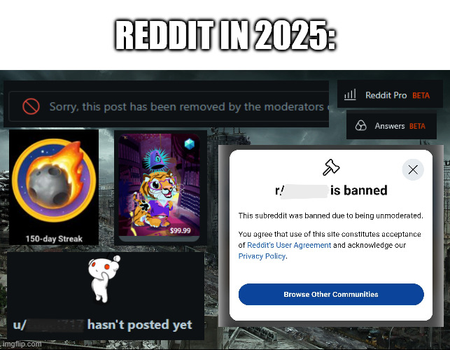 Random Rant: I feel like reddit died after they banned all the “unmoderated” communities. All the posts became sanitized. Now reddit is adding AI and streaks and NFTs to keep people on a platform that has no more content.