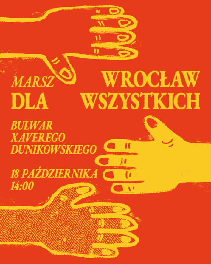 Marsz antyrasistowski | 18.10.2025 | 14:00–17:30 Spotkajmy się, aby wspólnie stworzyć przestrzeń radości, solidarności i otwartości. Przyjdźmy z rodzinami, przyjaciółkami i sąsiadami – każdy i każda z nas jest częścią tego miasta. Wrocław jest domem, w którym żyjemy, czasem z wyboru, czasem z konieczności, ale zawsze – z prawem do bezpieczeństwa, szacunku i godności. Nasz marsz to barwna, różnorodna manifestacja wspólnoty i solidarności. To radosny taniec, ale też mocne i jasne stanowisko: w obliczu rasizmu, ksenofobii, homofobii, mizoginii i każdej formy przemocy – wybieramy solidarność, równość i życie wolne od lęku. Wychodzimy na ulice,