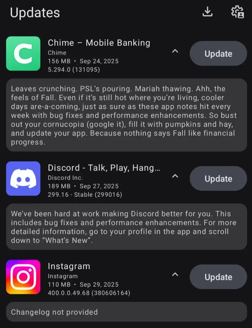 Youtube also does this. Basically it says “To see list of changes, look in the app guide” or something like that; no morons, I want to know what you changed BEFORE updating.