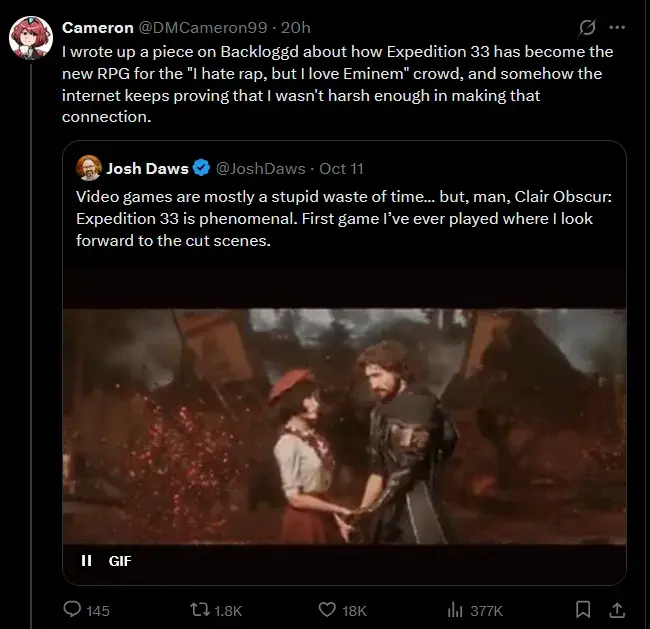 Yuritopiaposadism [none/use name]@hexbear.net to Games@hexbear.netEnglish · 2 months agoIt is tiring see people disrespect the JRPG genre just because they hate anime and act like a turn based game cant be mature. Nobody who says shit like this should be taken seriously.hexbear.netimagemessage-square42fedilinkarrow-up177arrow-down10