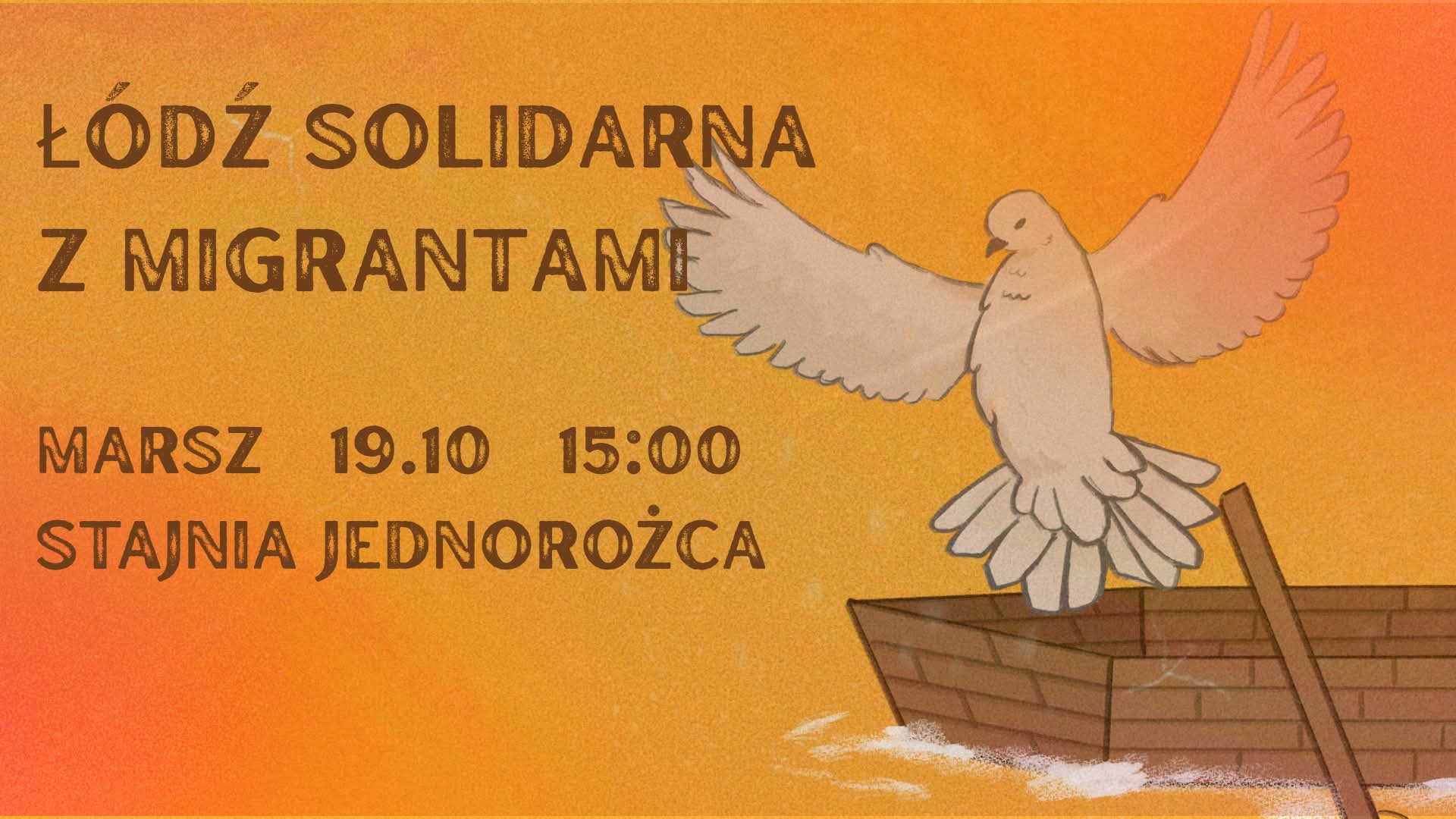 Tekst alternatywny: Grafika promująca marsz “Łódź solidarna z migrantami”. Po prawej stronie ilustracja przedstawiająca białego gołębia wylatujący z łodzi wiosłowej płynącej przez wzburzone morze. Tło grafiki stanowi gradient kolorów od różowego po żółty. Po lewej stronie znajdują się informacje związane z wydarzeniem. Data: 19.10.2025; godzina: 15:00; miejsce rozpoczęcia marszu: Stajnia Jednorożca.