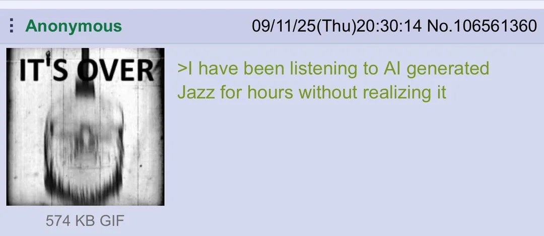 tbf, a lot of pop and generic stuff is incredibly soulless and it was made by people. One silver lining is that hopefully the artistic part will be more embraced in music because the driving force for a lot of it is money and not art. Not defending AI in any way though, fuck that bullshit to hell.