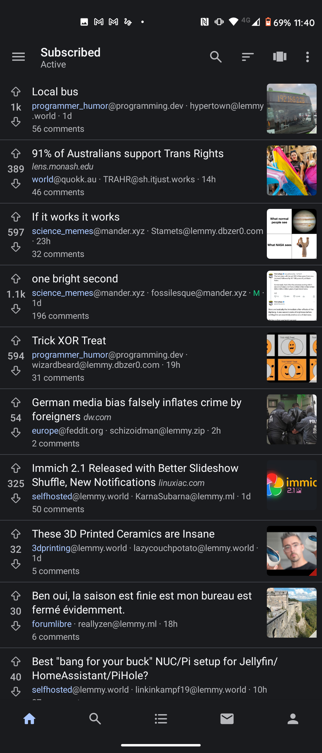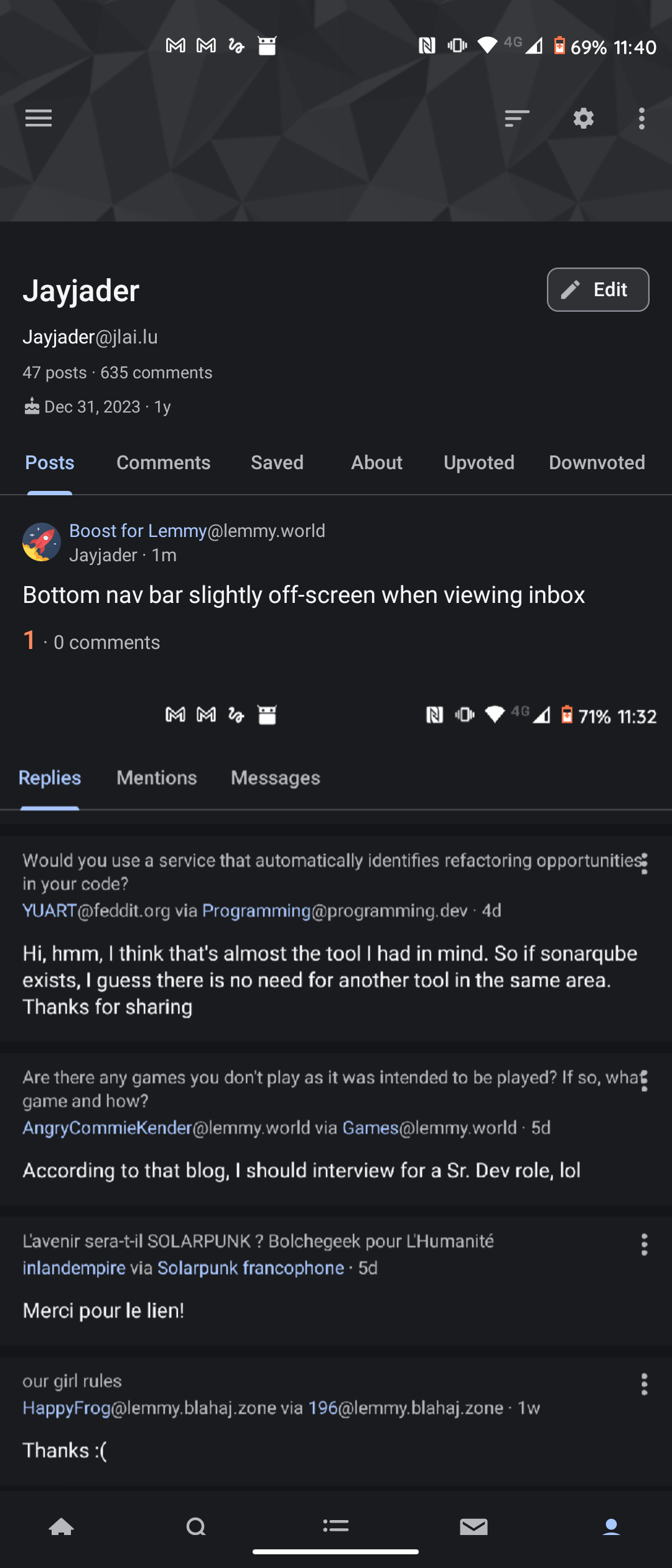 The bottom nav bar is fully on-screen when viewing feeds and posts.
