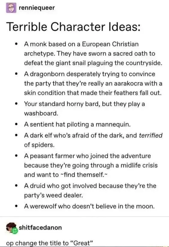 Hear me out: I played with an orc fighter who was convinced he was a mage, and tried to convince the rest of the party of the same thing. He carried a cast iron pan as his weapon, and his spells were “pan toss” and “pan smack”. There were a lot of laughs when NPC’s would be like “you’re clearly a fighter, you’re wearing plate armor” and he’d say it was his spell casting focus.