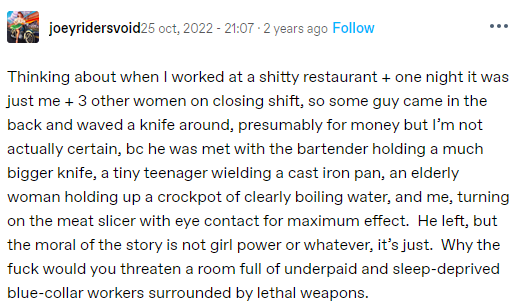 “Ah yes, let’s fucking ROB a KITCHEN with a POCKET KNIFE, when my would-be victims are surrounded by knives of all shapes and sizes, pans heavy enough to crack someone’s skull, cleavers that could take my limbs off in one swing, literal BOILING LIQUIDS in HUGE pots, and they’re also SERVICE WORKERS who are probably homicidal from the bullshit customers pull in a regular day’s work and are just looking for an excuse to kill someone legally. Surely I won’t get done like Julius Caesar.”