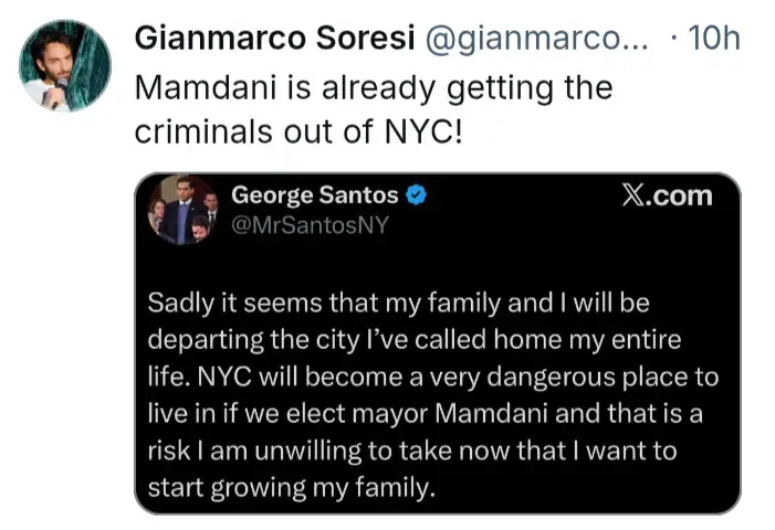 I’m not sure how much impact Mamdani would have as mayor on this, but it does seem that he would be the type to do what he could to get Santos arrested, and Santos seeing the writing on the wall has decided to GTFO before that happens.