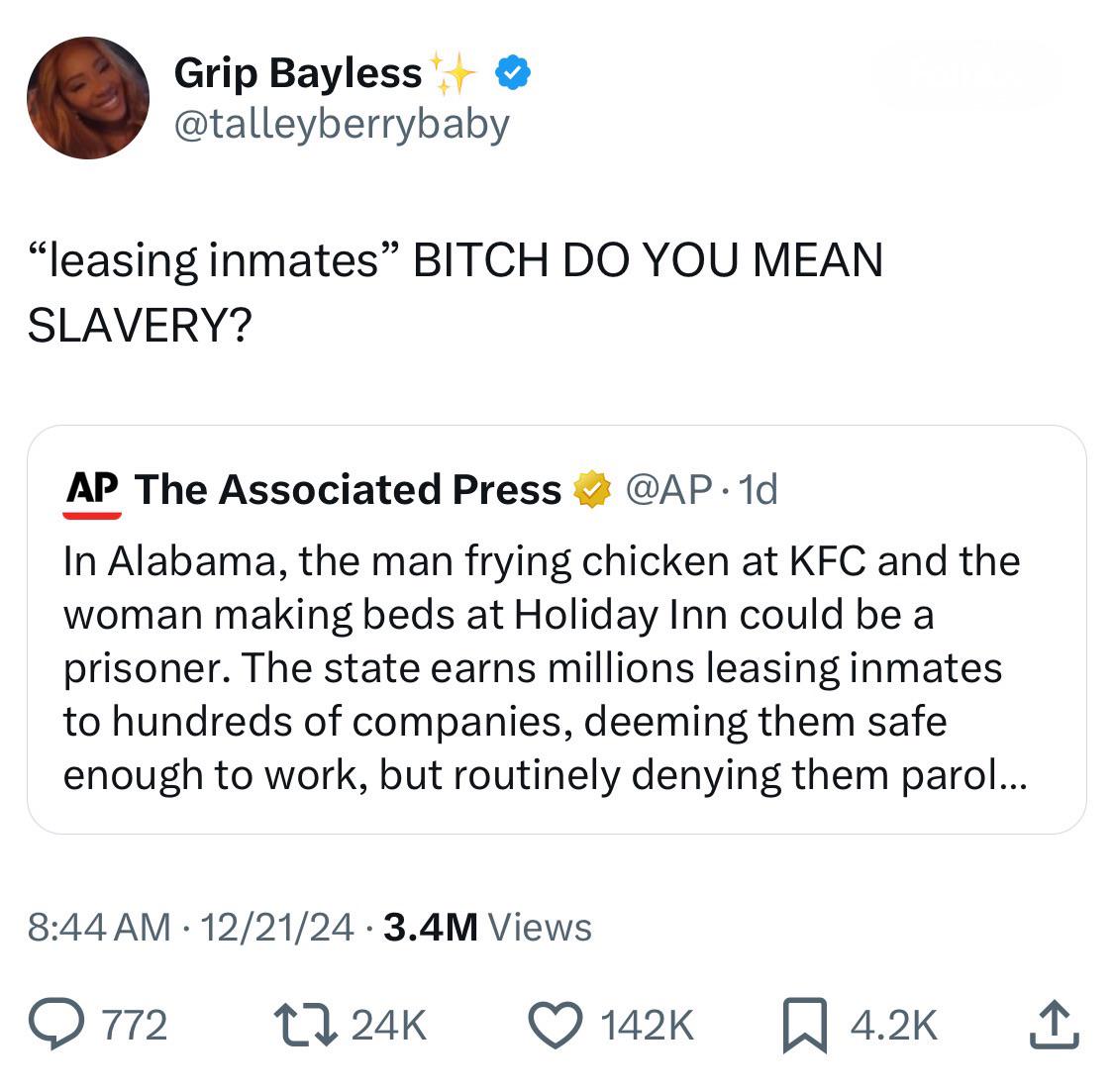 Most jobs are inside facilities, where the state’s inmates — who are disproportionately Black — can be sentenced to hard labor and forced to work for free doing everything from mopping floors to laundry. But more than 10,000 inmates have logged a combined 17 million work hours outside Alabama’s prison walls since 2018, for entities like city and county governments and businesses that range from major car-part manufacturers and meat-processing plants to distribution centers for major retailers like Walmart, the AP determined.