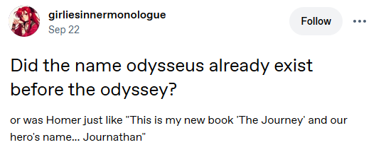 - but before the book no one was named Odysseus ever - The Odyssey was part of the Epic Cycle, so Homer likely inherited the figure of Odysseus from those stories. Whether he made up the name or the name Odysseus was already established, we simply do not know. Much has been lost to time, sadly. - Wether or not Homer’s writings are part of the Epic Cycle is very much a matter of… strong opinions of historians. There’s good reasons to include them (They’re about the same thing) and not to (Written later, and not lost, like all the other ones, so it makes the discussions annoying). We only know about most of the epic cycle because people wrote about the poems and made summaries and cliffnotes. - cliffnotes - Many people don’t realize the original Cliff was a hunter-gather circa 9342 BCE who began taking notes on cave walls, then passed down this practice for millennia before it was adapted to parchment and ultimately became the notes we read today.
