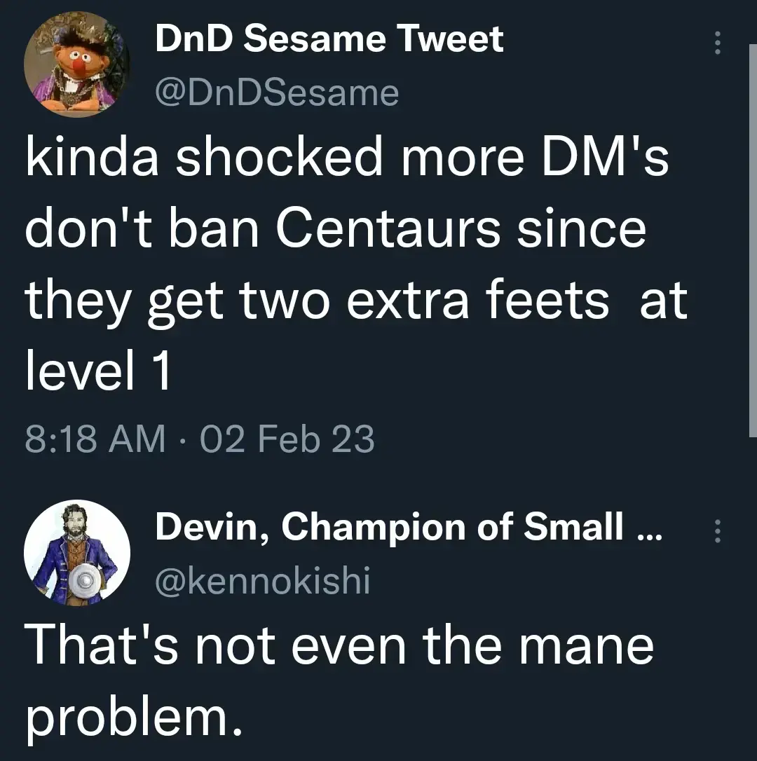 For some reason any time I have ever brought up playing a centaur, every DM always shoots it down either saying its a serious campaign or it doesn’t fit the vibe.