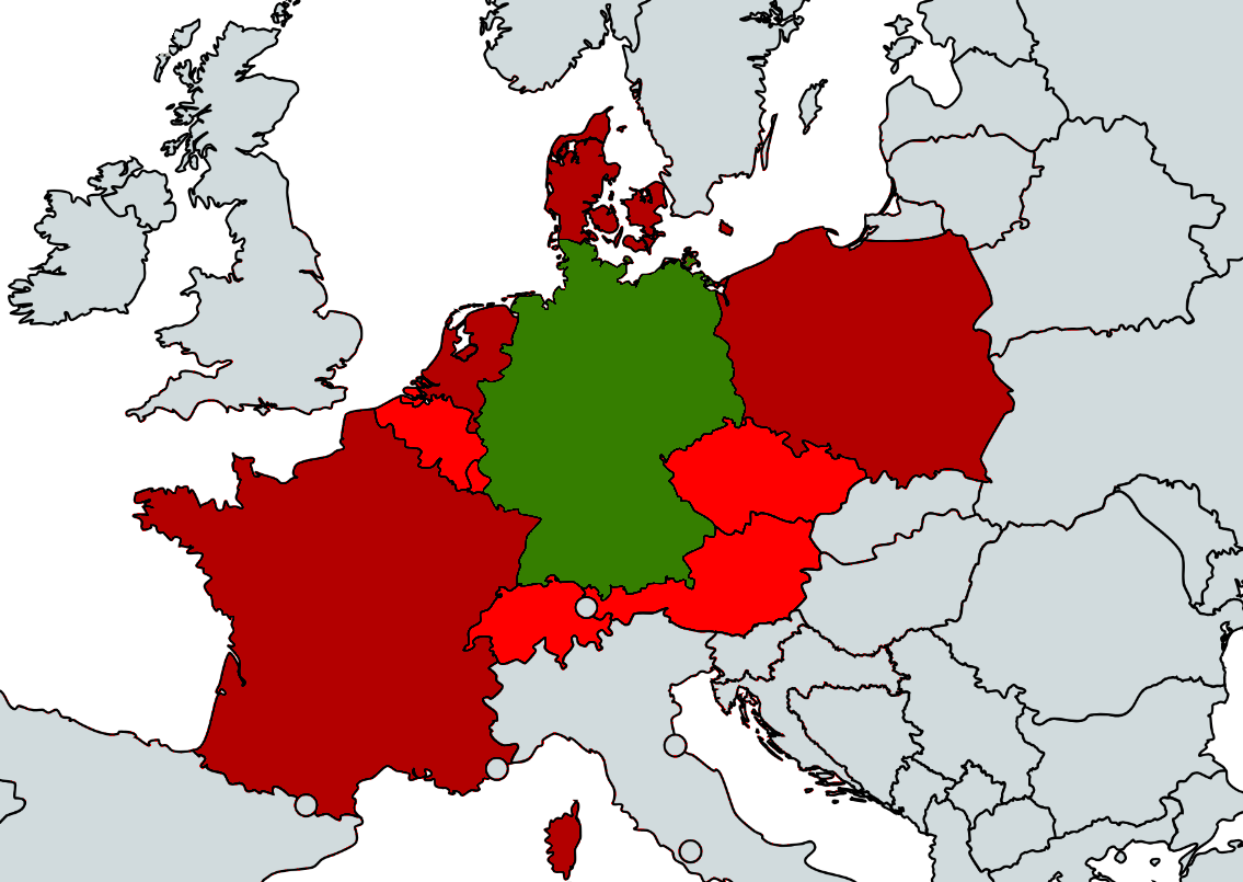 Grenzkontrollen von und gegen Deutschland (dunkelrot) und von Deutschland (rot). Alle dunkelroten Staaten haben mit ihren Grenzkontrollen erst angefangen, nachdem Deutschland 2023 damit angefangen hat. Dänemark und die Niederlande erst, nachdem die deutschen Grenzkontrollen 2025 verschärft wurden. 2023 hat die Ampel die Grenzkontrollen sporadisch installiert, ab 2025 wurden sie von Dobrindt verschärft und verfestigt.