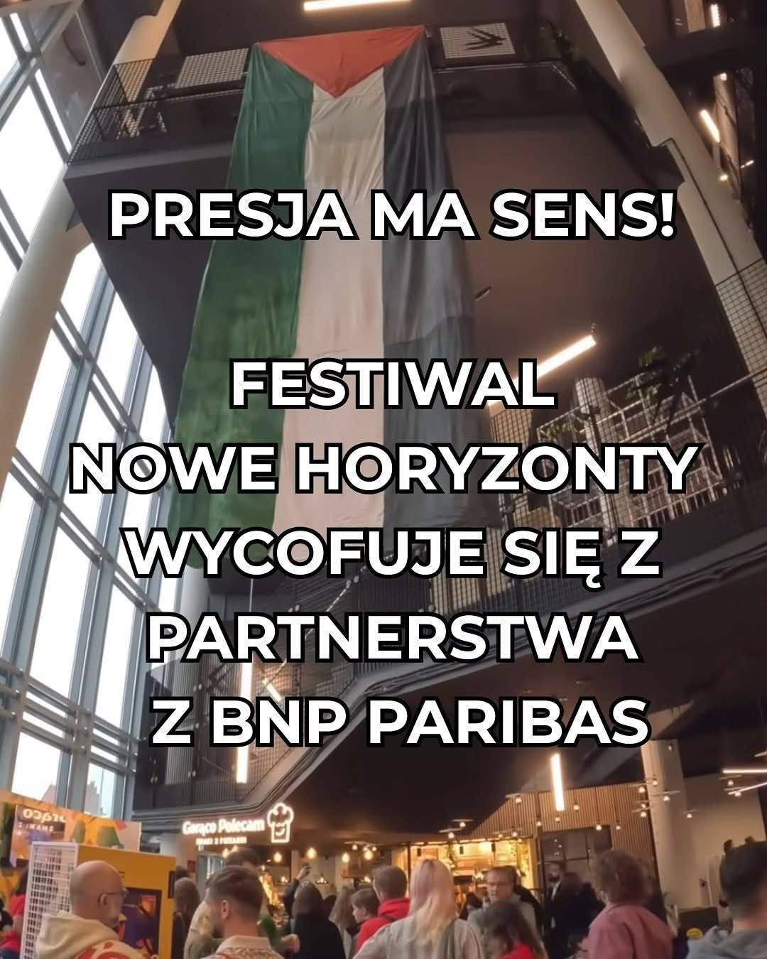 Nasze wspólne działania przyniosły realny efekt. Po naszej wspólnej presji, oddolnych protestach i rozmowach - Festiwal Nowe Horyzonty ogłosił zakończenie współpracy z BNP Paribas.