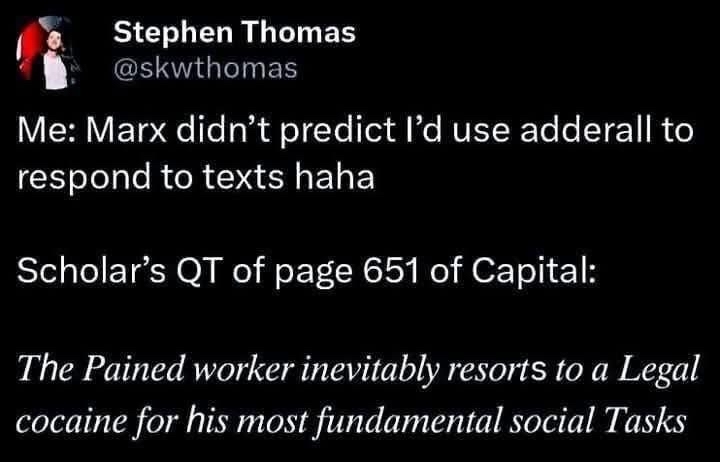 "u/reinschlau • 1y ago It’s a joke. But out of curiosity I ctrl+f’ed through the collected works, and the only mention of cocaine was in a letter from Engels to Ludwig Kugelmann (volume 48), in 1889 (after Marx’s death, when Engels would have been editing Capital vol 3 and whatever else Marx left behind):