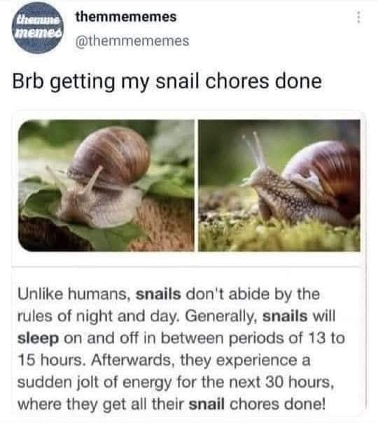 Secret Music 🎵 [they/them]@piefed.blahaj.zone to Animals with Jobs@lemmy.worldEnglish · 7 days agoSnail chorespiefed.cdn.blahaj.zoneimagemessage-square15fedilinkarrow-up1287arrow-down10