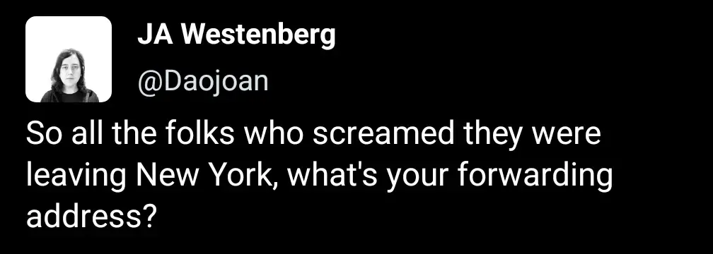 They’re leaving NYC like a lot of those folks who said they were leaving America if Trump won are moving to… I dunno… wherever they were planning to go.