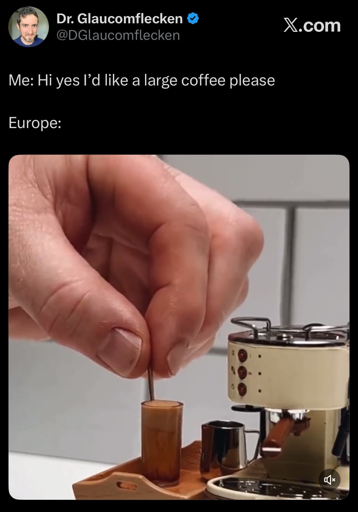 minus-squareoptional@sh.itjust.workslinkfedilinkarrow-up2·edit-25 days agoIf you don’t want that, just don’t order “Kaffee”. Every half decent bakery sells Espresso or Café Crèma, you just have to ask for it.