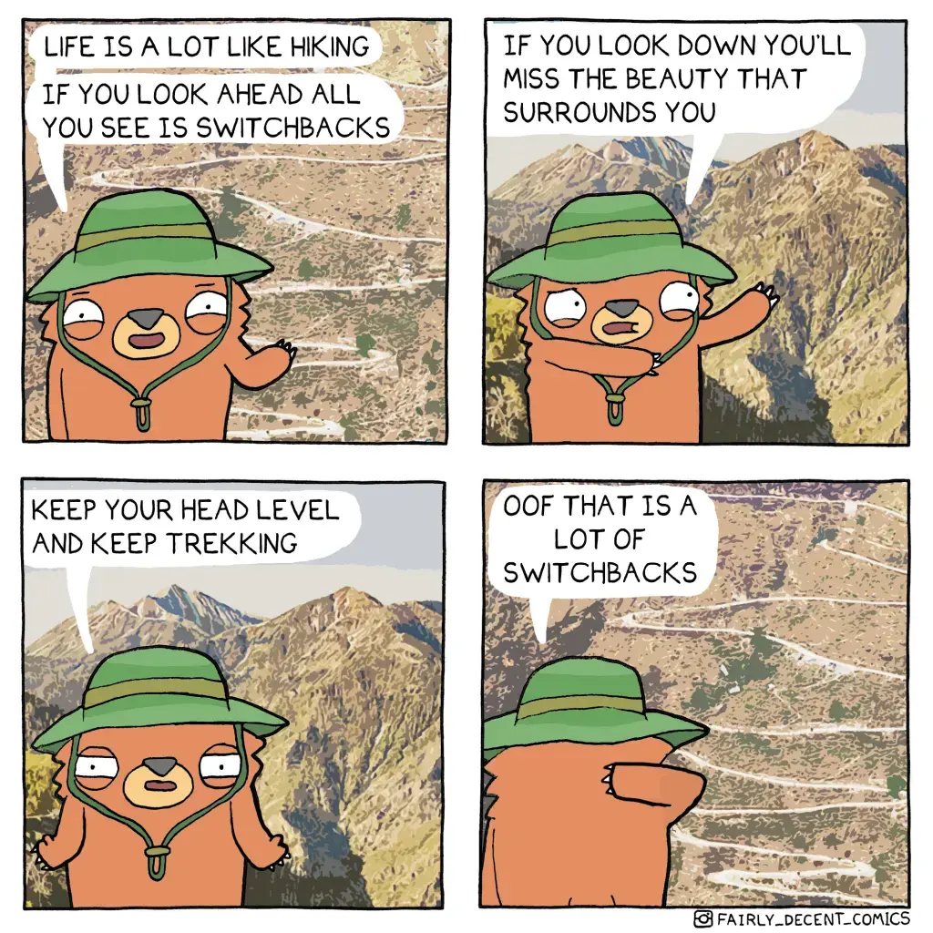 Panel 2 misses one of the attractive points of hiking for me: a healthier sense of perspective. When you can experience the vastness of wilderness and realize your relatively microscopic relationship to such an overwhelming scale, you can begin to realize your little rat-race anxieties down below are something you can shed entirely.