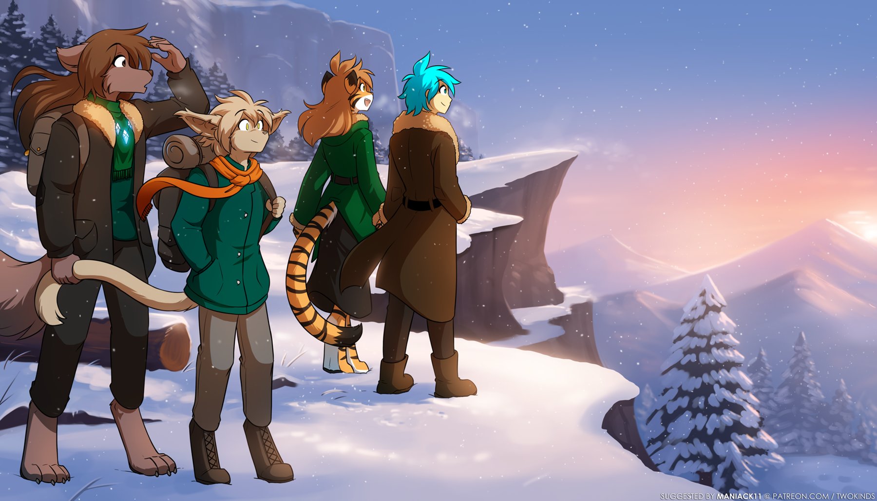 The digitigrade shoes look so cool! The whole scene is lovely. The cold snow everywhere, cold, fresh air, a sunset / sunrise in the distance, and the feeling of being far away from the noise of everyday life turn this into such a cosy yet adventurous piece :3