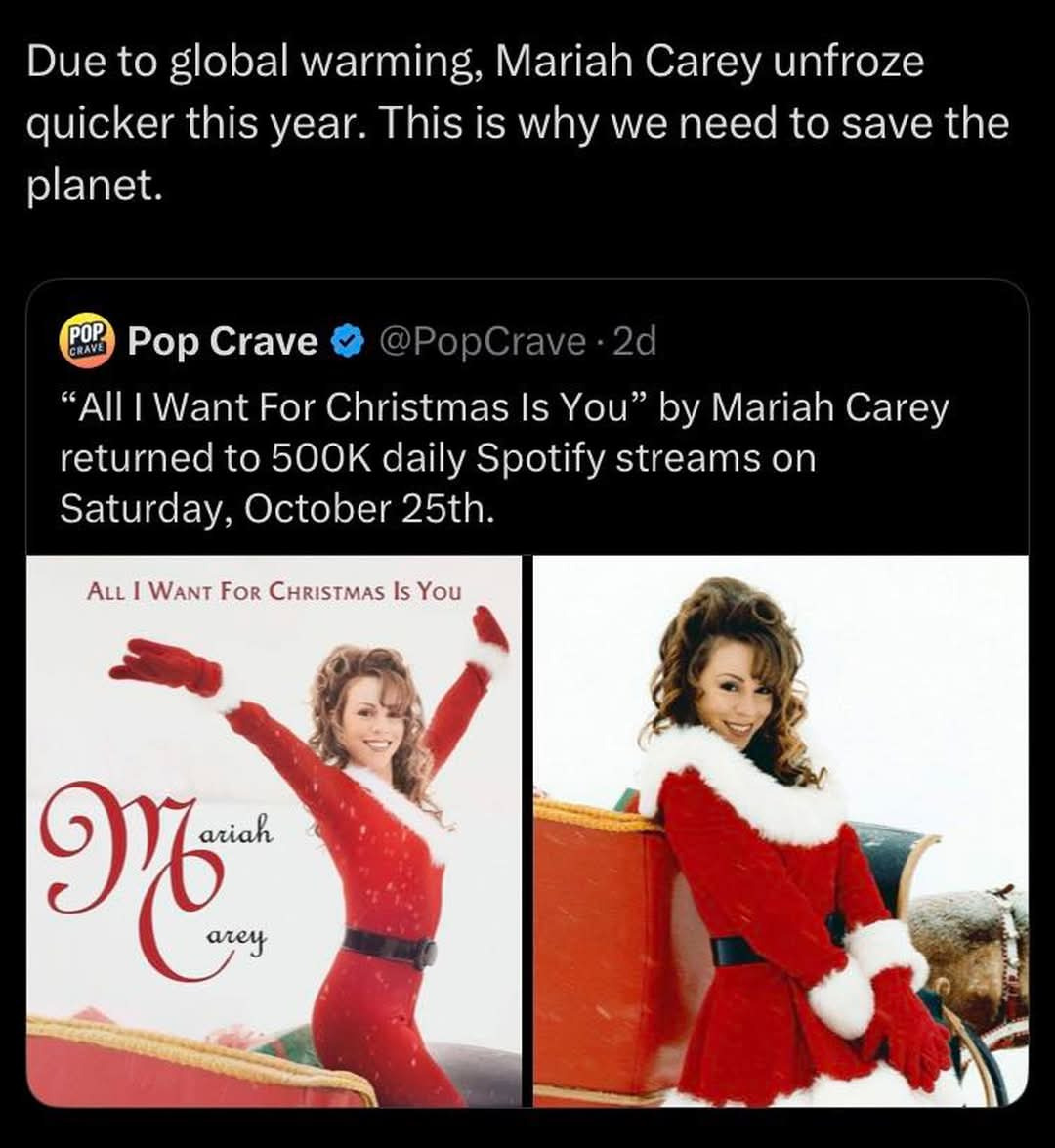 This is hilarious and terrifying at the same time. The artist behind “All I Want For Christmas Is You” hitting big streams in October is funny, but the punchline about global warming actually stings. Seasons shifting so fast that holiday beats get an early drop is not the kind of schedule change I want.