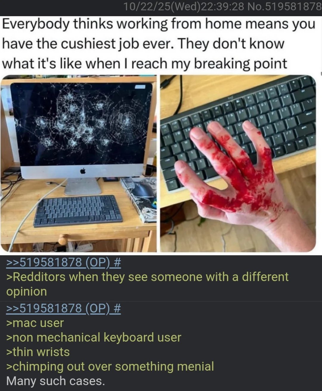 Also, I agree with your assessment - there’s no blood on the keyboard or desk or embedded in the glass of the computer itself, and yeah, that kind of damage WILL see blood AND chunks of glass in the knuckles of the hand.