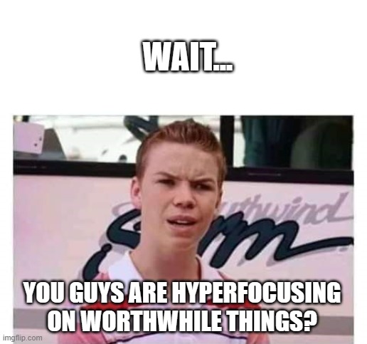 what’s that hyperfocus thing ? I thought adhd was essentially the inability to focus ? I have days like this, I start a task and I just don’t look away for seven or eight hours. It’s not exactly healthy, but if I pause for even a few minutes then I may not resume at all. Is that what this meme is referring to ?