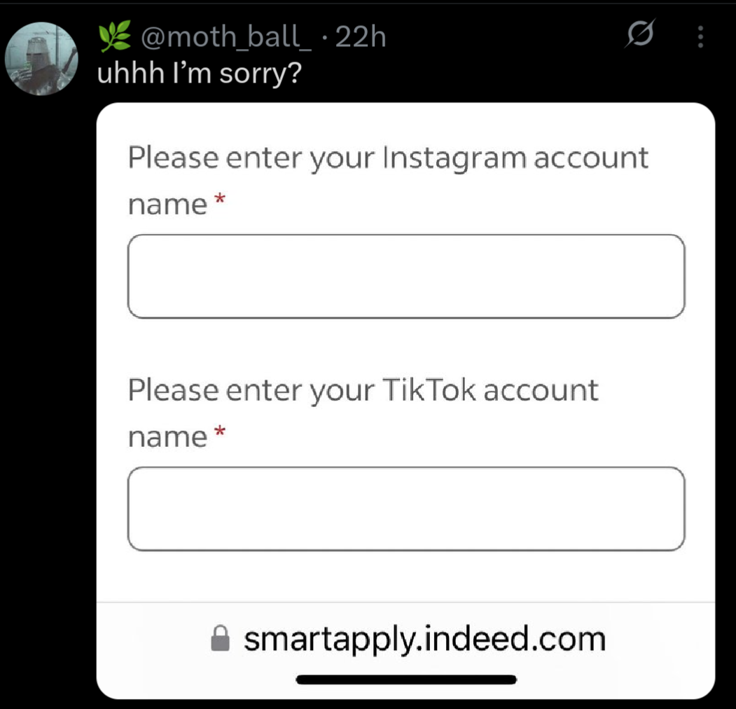 arrow-up1773arrow-down1imageJob applications want your whole life media.piefed.worldThe Picard Maneuver@piefed.world to Microblog Memes@lemmy.worldEnglish · edit-23 days agomessage-square175fedilink