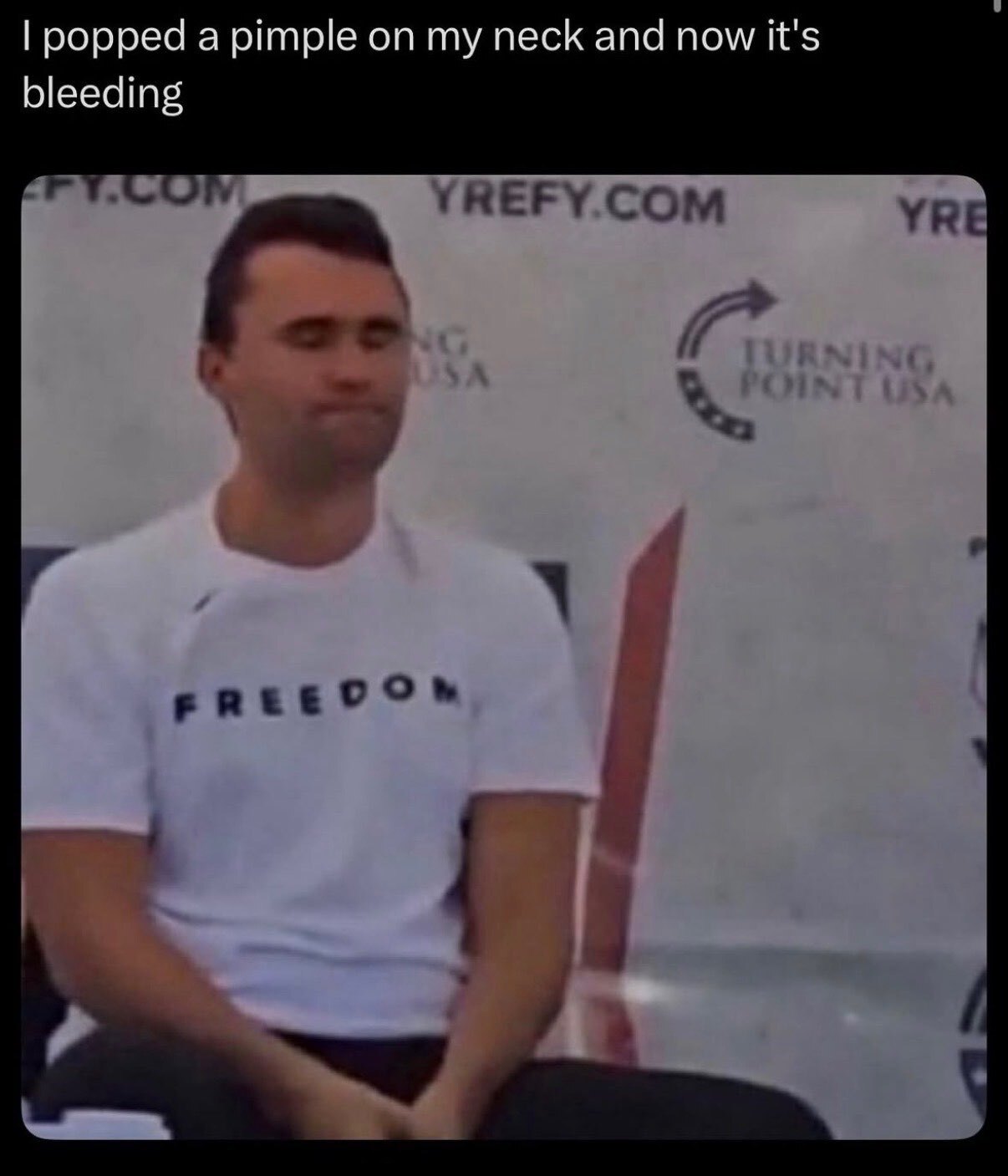This is so weird because I basically never get pimples, especially on my neck. But within a day of seeing this thread I now have a deep angry bump on my neck. Charlie Kirk is performing witchcraft from beyond the grave.