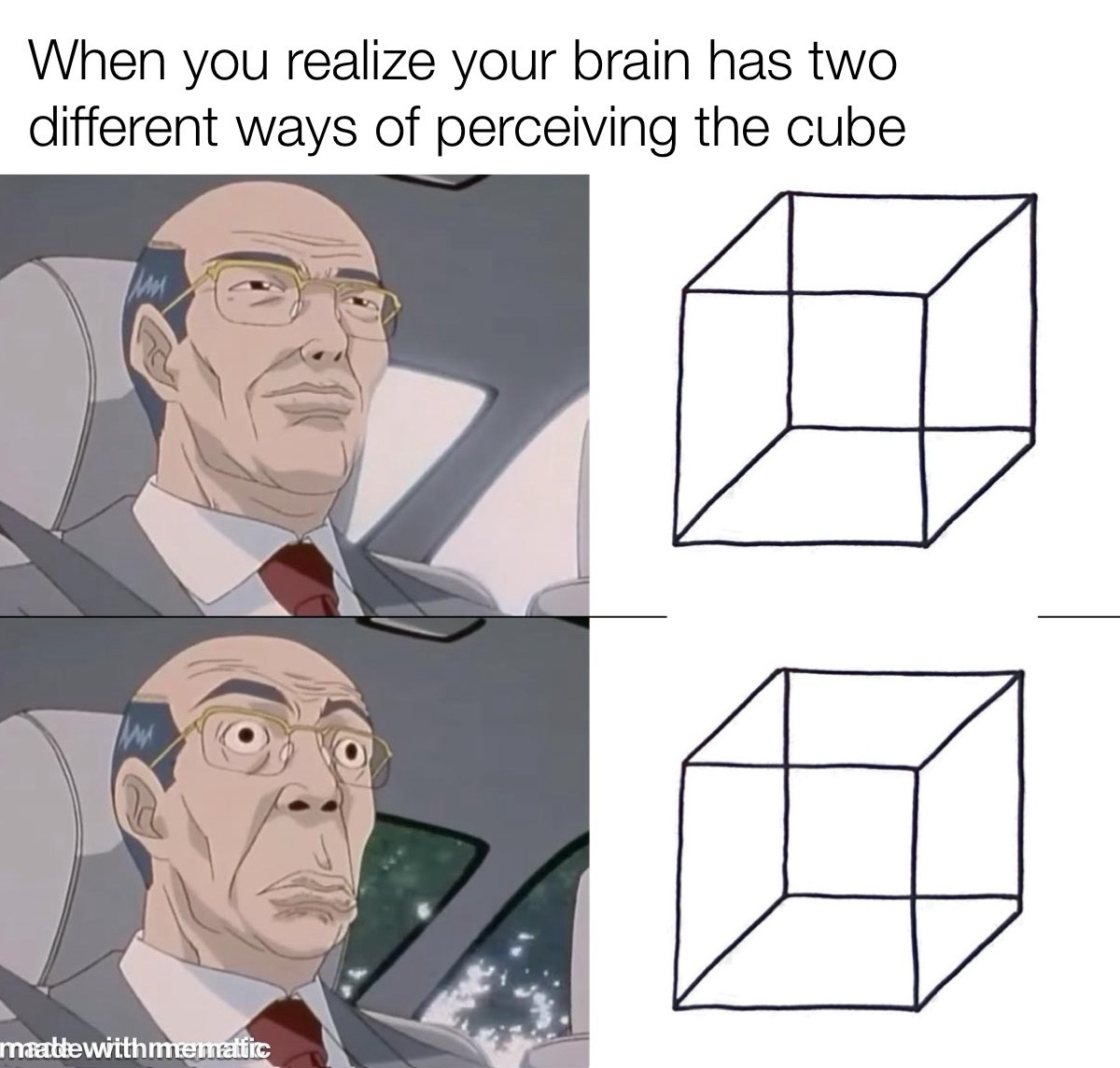 Perceived one way, the side of the cube facing you is facing downward and towards your left and you are seeing the inside of the bottom face through the rest of the cube. With a shift in perception, you can see it so that the face towards you is angled up and to the right and you see the bottom face from below the cube.