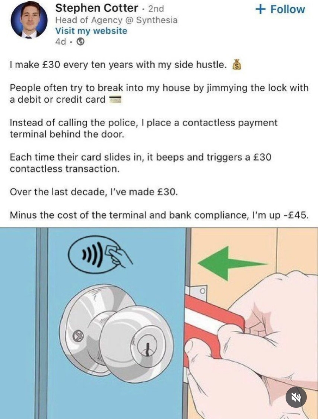 arrow-up1578arrow-down1imageSPLT: You can also put a chip reader on your pocket and casually bump into people.slrpnk.netkriz@slrpnk.net to Shitty Life Pro Tip@lemmy.world · 1 day agomessage-square23fedilinkcross-posted to: linkedinlunatics@sh.itjust.works