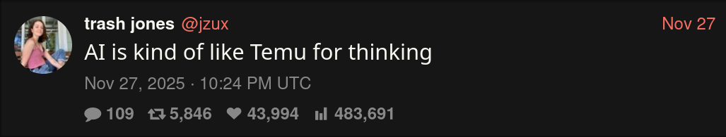 arrow-up1505arrow-down1external-linkAI is like Temu for thinkinglemmy-api.eviltoast.orgorhtej2@eviltoast.org to Microblog Memes@lemmy.worldEnglish · 22 hours agomessage-square13fedilinkfile-text