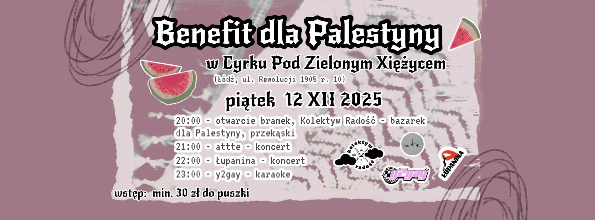 Siemano! Zapraszamy was na benefit dla Palestyny organizowany przez y2gay i Kolektyw Radość 🇵🇸 Na miejscu bazar, żarcie i koncerty od Łupaniny oraz Attte, a potem karaoke 🎶 100% hajsu z puchy i bazaru leci na pomoc Palestynie (The Zaynab Project), zachęcamy więc do przychodzenia oraz pomagania 🫡