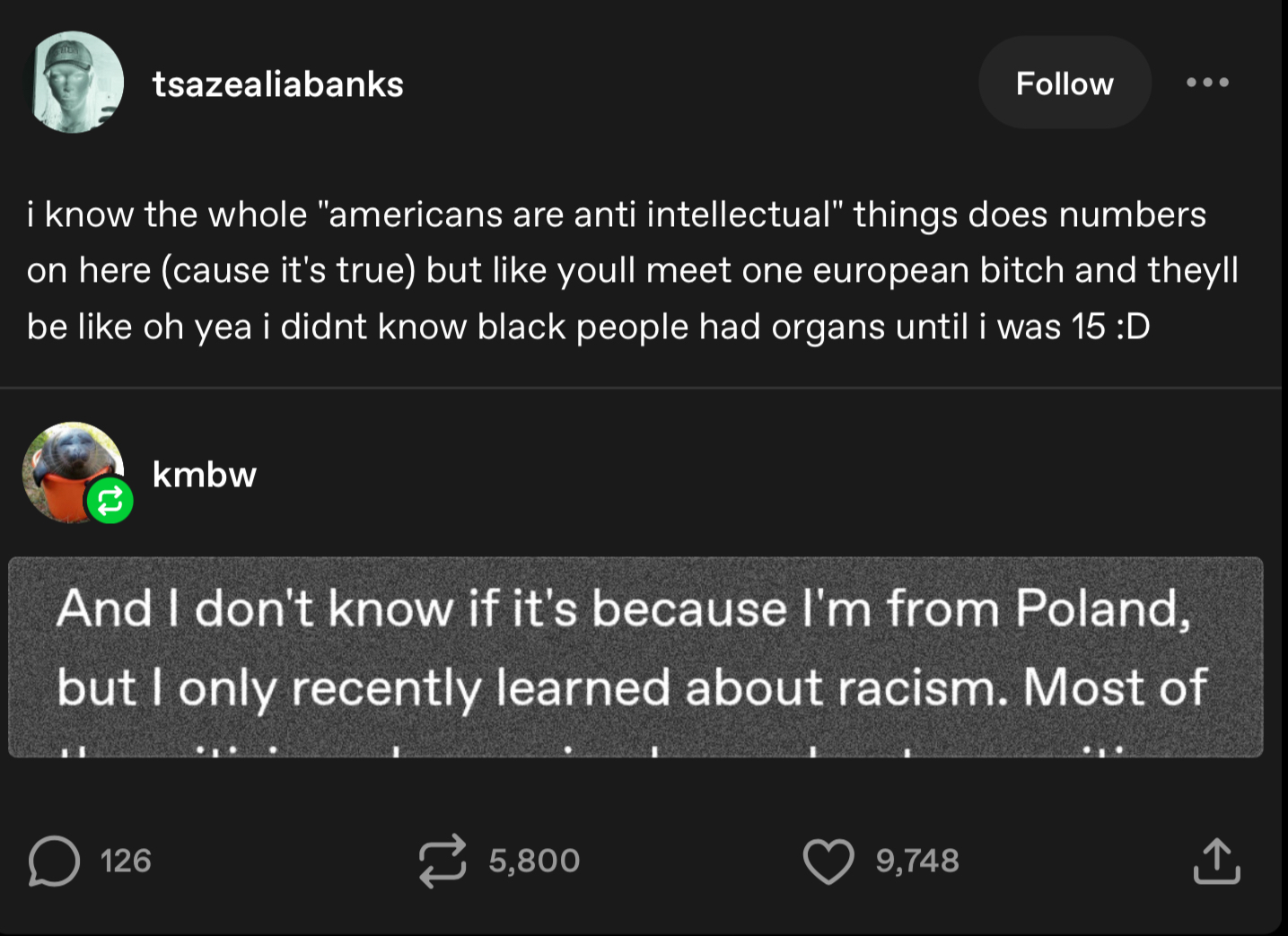 So they did a full round of about 20 people throwing the worst racism/nationalism I’ve ever come across in real life at each other, including absolutely dunking on the only black guy as if he was a representative for all africans, then like a hive mind they all turned to me and someone went “At least none of us are as racist as these Americans!” followed by uproarious laughter. I ask myself internally all the time if my behavior is problematic, but it seemed like these people never learned that skill but instead were taught “USA=racist, everyone else is good” and never questioned it or themselves.