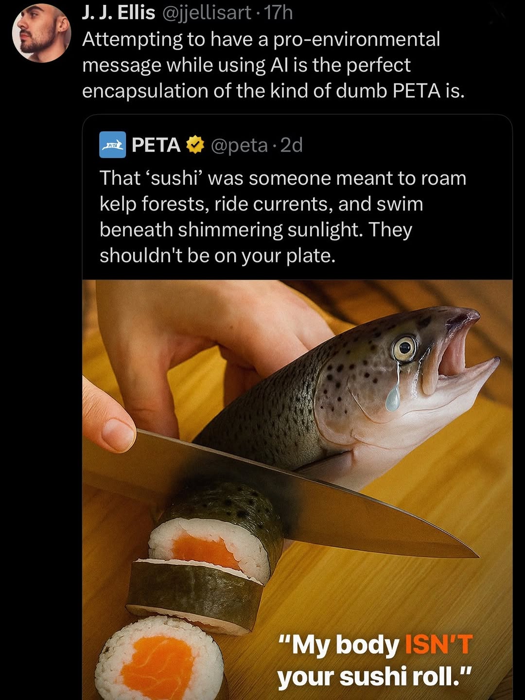 A farmed salmon would use / pollute orders of magnitude more water then an ai image. Even if peta was willing to buy salmon there wouldve been way more resources used to create this in real life then via ai. Just the rice in the sushi would’ve required more water to grow and then prepare compared to the AI image.