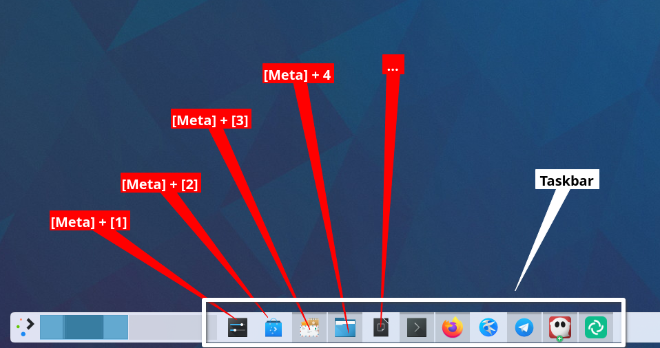 Reach the first app on the left with [Meta] + [1], the second from the left with [Meta] + [2], etc.
