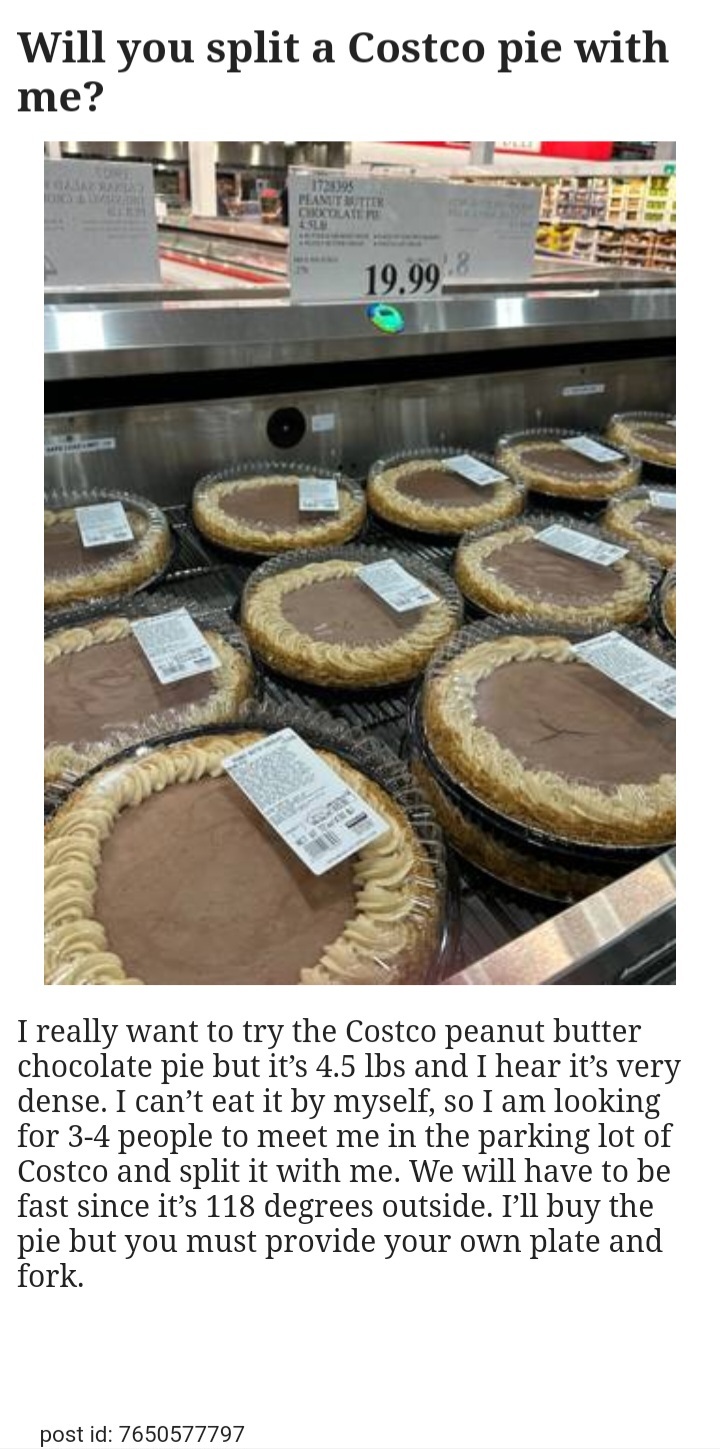 That sounds like it would taste pretty good, but I just have no desire to stand in the blazing hot parking lot of a Costco with a group of strangers all furiously wolfing down a pound of chocolate pie each lol