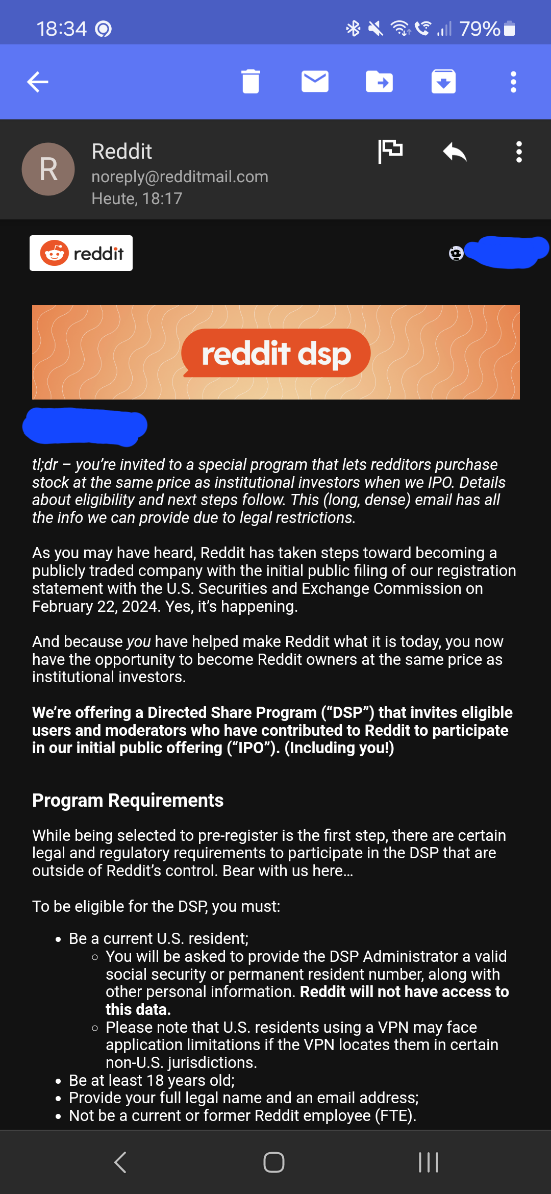 We’re offering a Directed Share Program (“DSP”) that invites eligible users and moderators who have contributed to Reddit to participate in our initial public offering (“IPO”). (Including you!) Program Requirements While being selected to pre-register is the first step, there are certain legal and regulatory requirements to participate in the DSP that are outside of Reddit’s control. Bear with us here…