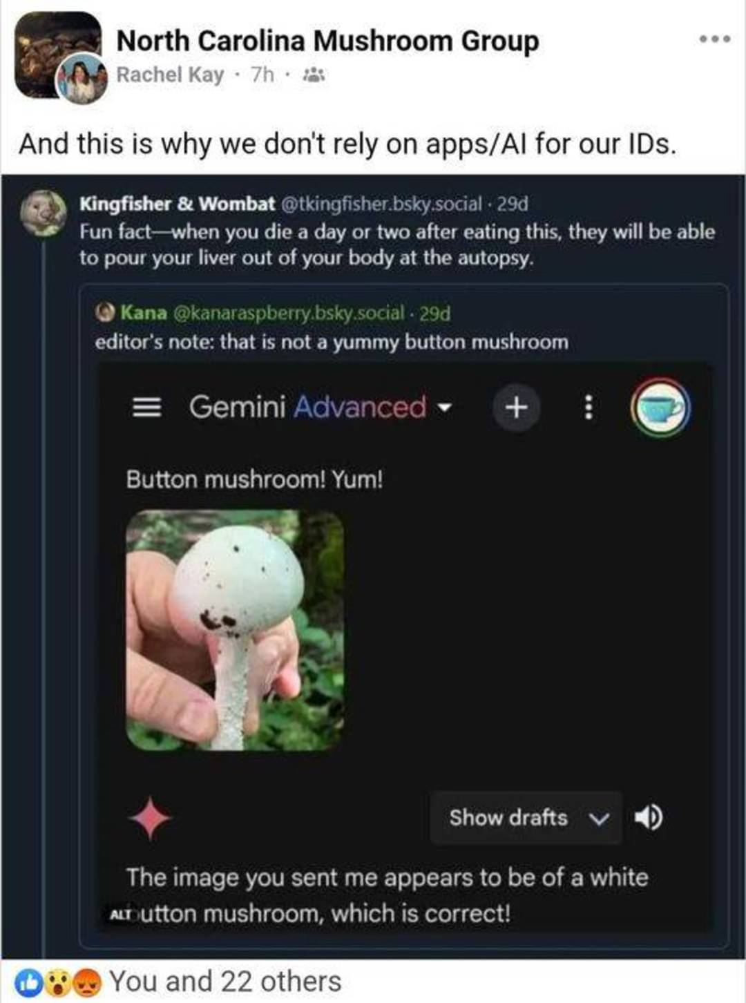 25 years ago I made an AI Neural Network to identify mushrooms, at the end of the project I came to the conclusion it was necessary to dissect mushrooms and ask questions regarding smell and texture to identify correctly, and even then the possibility of error made the program unethical to produce. I’m so glad AI is being used responsibly a quarter of a century later.