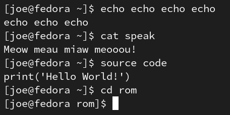 - cat: displays the content of a file if given, the content of the file “speak” was “Meow meau miaw meooou!”