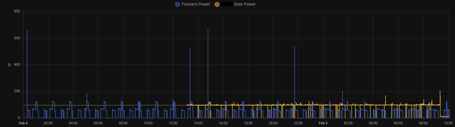 The PC itself was drawing ~90 watts. The current draw right now - dual 1080p monitors, HA server, a 5-port switch, and a couple other small things - is about 12 watts. Desk power measurement is the yellow line, freezers are the blue line.