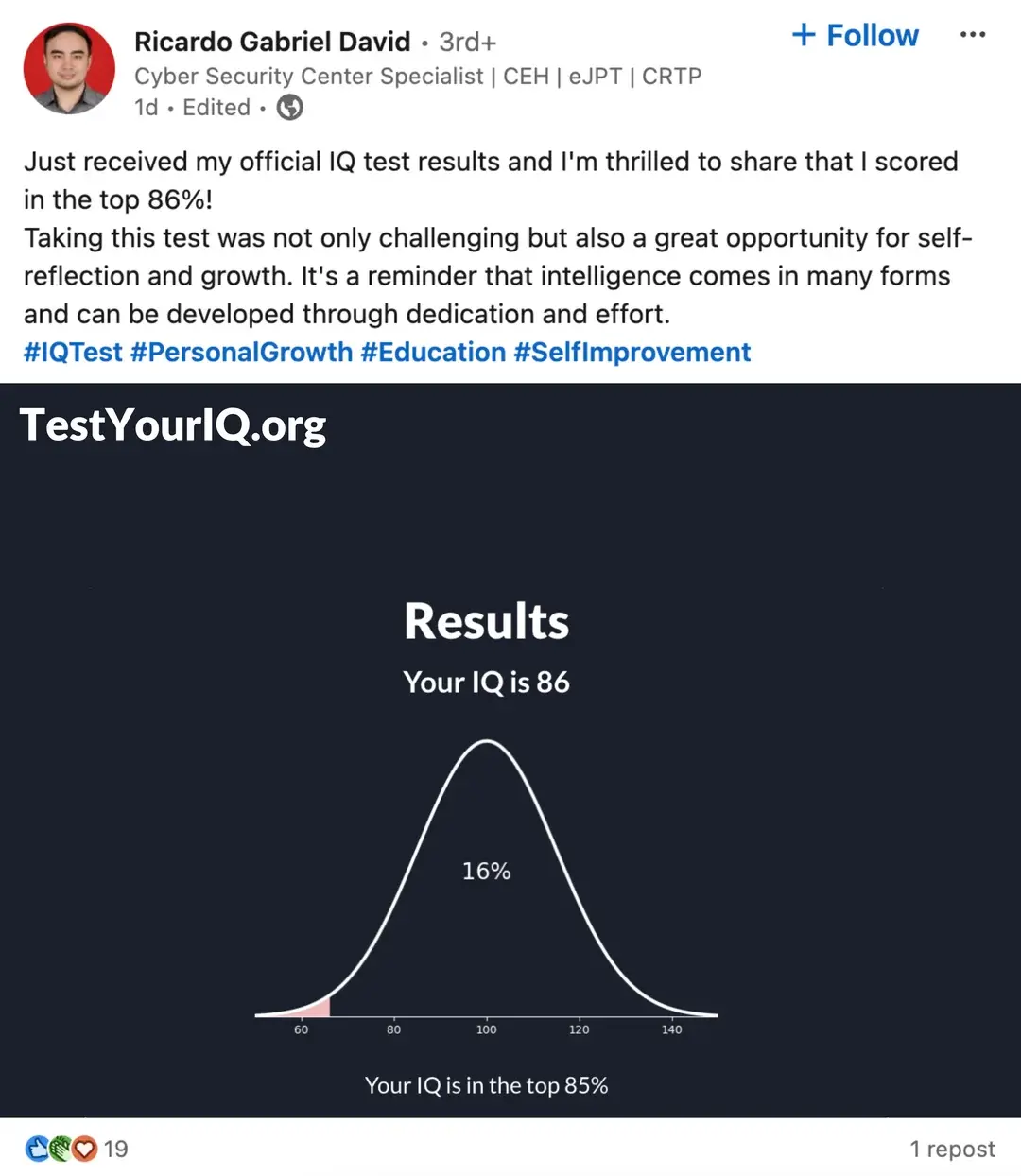 That distribution chart is fucky. It says that the IQ is 86, and that’s 15th percentile, but the line at the bottom clearly shows that the number is a little under 70. So something is not right here, and I suspect it’s because this is a shitpost.