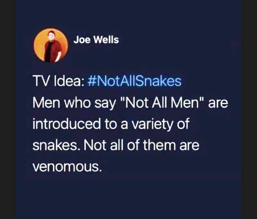 ‘Blame all men’ is your message, your strategy, distilled into a slogan. Be wary of all of them, all the time, you never know which one could hurt you.