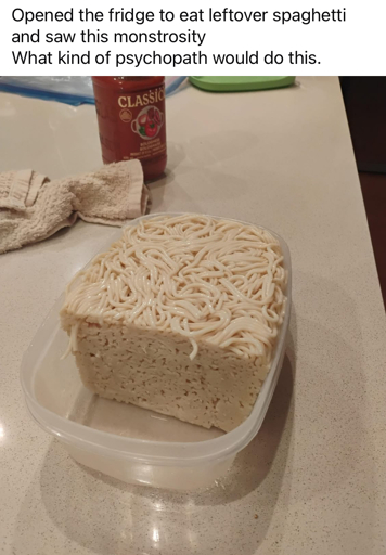 ickplant@lemmy.world to Food Crimes - Offenses against nutrition@midwest.socialEnglish · 11 months agoSpaghettimidwest.socialimagemessage-square92linkfedilinkarrow-up1445arrow-down19