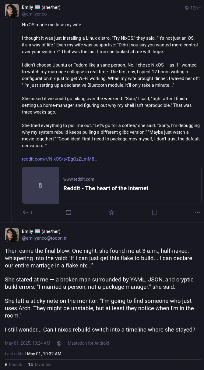 eselect newsthat would have avoided the last stack of 6 compounding issues in the first place.But I love how fun it is and I’m never leaving no matter what other nix-like cults pop up