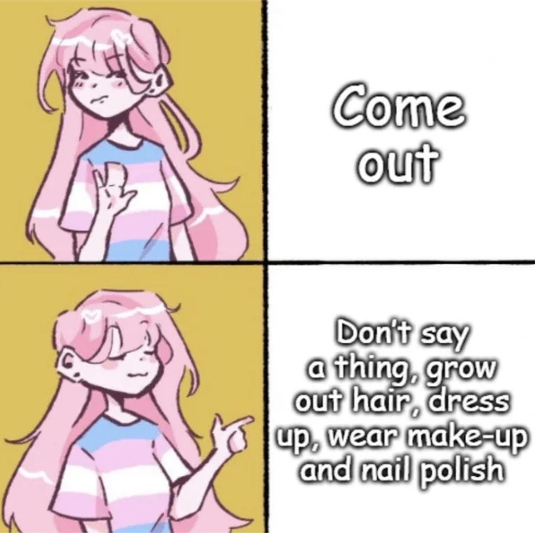 Yeah I think I have that problem. I’ve had my hair long for ~8 years, am regularly wearing nail polish, I have a long skirt I like to wear around the house and nobody cares. Should just come out already, but that’s scawy