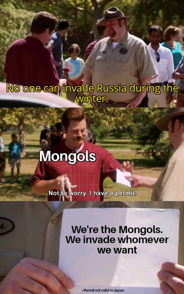 I saw a documentary recently that claimed that one of the reasons the Mongols were so successful was that they attacked in the middle of winter. So for most people fighting in the cold was unthinkable, but for the Mongols it was Tuesday.