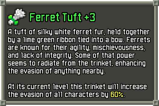 (Image Description: An image showing the item info window for the new Ferret Tuft item. It reads: “Ferret Tuft +3: A tuft of silky white ferret fur, held together by a lime green ribbon tied into a bow. Ferrets are known for their agility, mischievousness, and lack of integrity. Some of that power seems to radiate from the trinket, enhancing the evasion of anything nearby. At its current level this trinket will increase the evasion of all characters by 60%.”)