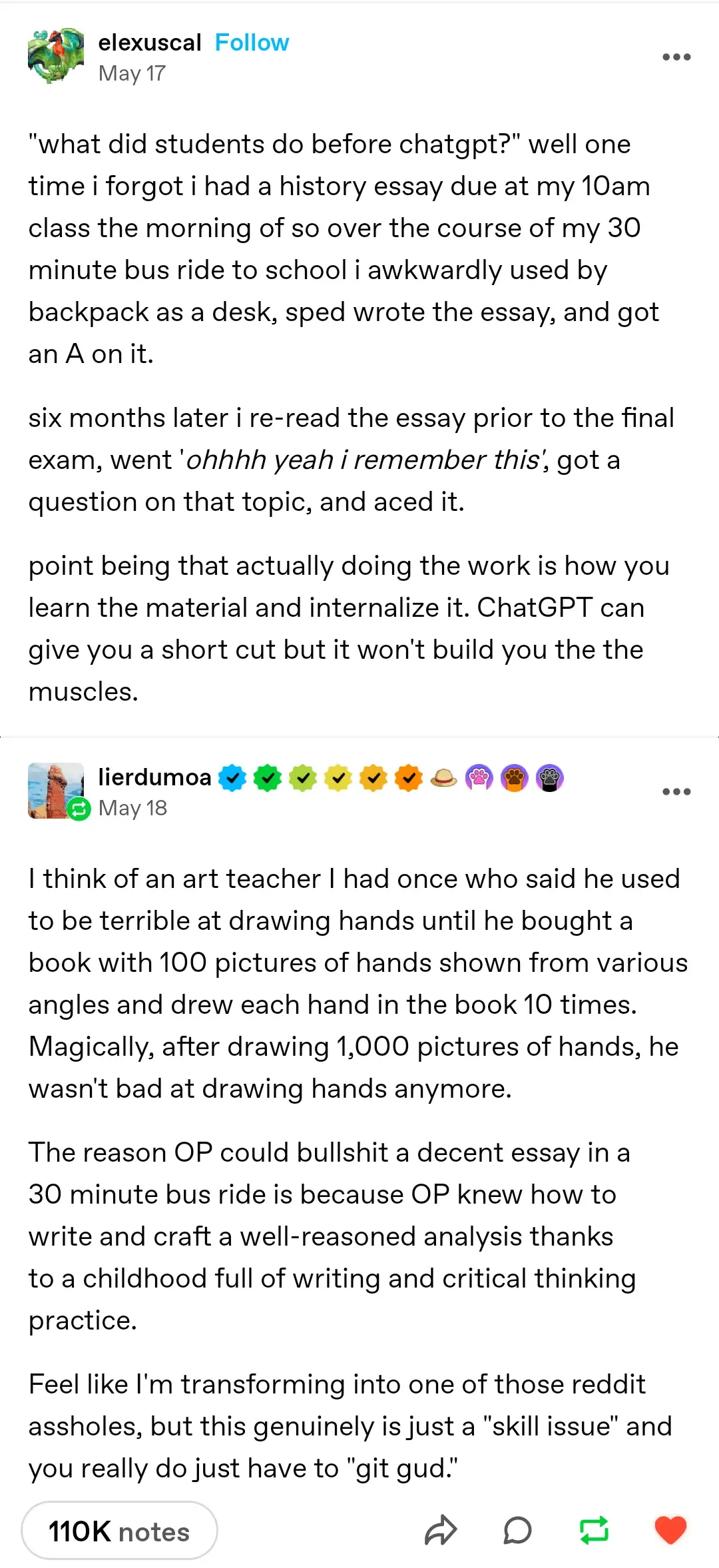 arrow-up11.12Karrow-down1external-link"What did students do before chatgpt?"lemmy.blahaj.zoneInterstellar_1@lemmy.blahaj.zone to Curated Tumblr@sh.itjust.worksEnglish · 4 months agomessage-square141fedilink